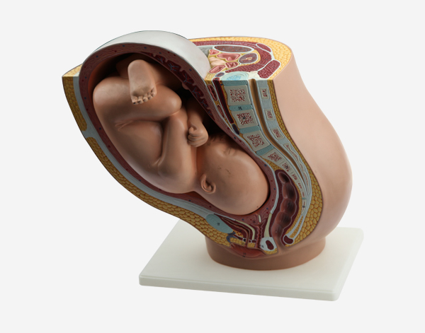 This life size model depicts the female human pelvis in median section with a fetus in the 40th week of pregnancy.The fetus is in the normal position prior to birth, showing the anatomical relashionship between various structures of the materal pelvis and the fetus. Fetus is detachable for closer examination. Size(cm):40x26x34